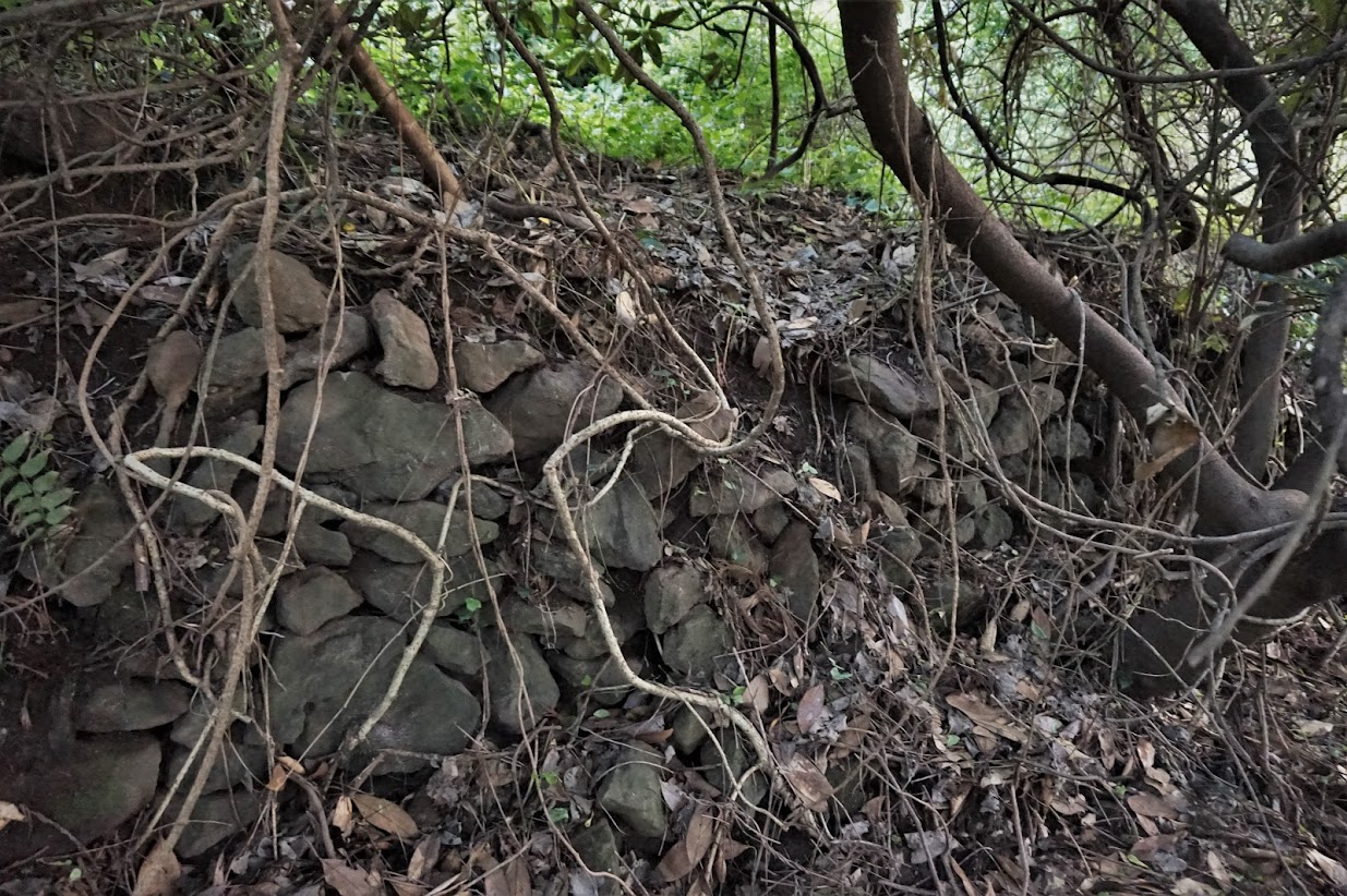 ⑯鵜山の西の端っこ。アーチ式の石門の西側には石垣は一切見受けられなかったが、西の端っこまで行くと突如として現れる!